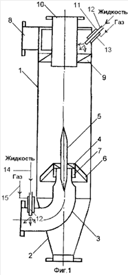 Распыливающий агент, например воздух, подается по газовому каналу 17, где встречает на своем пути резонатор, выполненный в виде сферической полости 31, соединенной с кольцевой щелью (соплом) 19 посредством калиброванного отверстия 32. В результате прохождения резонатора распыливающим агентом (например, воздухом) в последнем возникают пульсации давления, создающие акустические колебания, частота которых зависит от параметров резонатора. Акустические колебания распыливающего агента способствуют более тонкому распыливанию раствора, подаваемого в кольцевую полость 18, из которой жидкость вытекает в виде пленки на площадку 24, а затем дробится под воздействием акустических колебаний воздуха на мелкие капли, в результате чего образуется факел распыленного раствора с воздухом, корневой угол которого определяется величиной угла наклона конической поверхности 22 кольца 21.