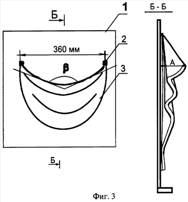 Поставленная задача достигается тем, что в способе, включающем подготовку и разметку образца, фиксацию, измерение проекций, утла и количества складок используется образец из различных материалов, например шелковой, льняной, хлопчатобумажной, шерстяной тканей, нетканого и трикотажного полотен в форме круга диаметром 400±1 мм, разметку осуществляют в различных направлениях, например под углами ( ) 0, 15, 30, 45, 60, 75, 90…345° к продольному направлению (фиг.2), фиксацию сложенного вдвое образца 3 ведут поочередно для каждого диаметрально противоположного направления в двух вертикальных зажимах 2 по одной горизонтали, закрепленных на опорной поверхности 1 на расстоянии 360±1 мм, с образованием естественных ниспадающих складок под действием собственной массы (фиг.3). Через 5 минут после фиксации проводят измерения максимальной проекции самой удаленной точки сгиба образца от опорной поверхности в плоскости симметрии образца, перпендикулярной опорной поверхности (А ), которая выявляет потенциал ткани для образования ниспадающих складок; угла верхней складки ( ), по которому судят о приемлемости формы складки для конкретного коструктивного решения моделей одежды и портьер, и количества складок (n ), которое позволяет прогнозировать способность ткани образовывать определенное количество складок.