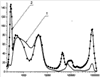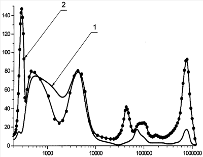 С целью определения эффективности осаждения высокомолекулярных белков кипячением сыворотки крови нами были проведены исследования супернатанта из сыворотки крови донора и больного деструктивным панкреатитом методом высокоэффективной жидкостной хроматографии. Из хроматограммы, где по оси Х отмечена молекулярная масса, а по оси Y – интенсивность пика (см. чертеж) видно, что как в супернатанте из сыворотки крови донора (1), так и в супернатанте из сыворотки крови больного деструктивным панкреатитом (2), содержание фракции веществ с молекулярной массой менее 10000 дальтон составляет от 60 до 80%. Полученные результаты свидетельствуют о высокой эффективность применяемой методики осаждения белка.