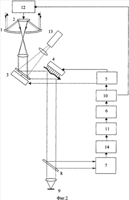 Предлагаемое устройство активной АОЭС управления телескопом работает следующим образом. Световой сигнал от устройства формирования опорного точечного источника, построенного на базе когерентного источника излучения, проходя двухкоординатное зеркало общих наклонов (3), вторичное (2) и главное (1) зеркала телескопа, отражается от лоцируемого объекта, либо за счет обратного релеевского рассеяния в атмосфере создает опорный точечный источник (звезду), находящийся в одной изопланарной области с лоцируемым объектом, и возвращается обратно в телескоп. Далее световой сигнал от телескопа (1, 2) поступает через коллиматор на двухкоординатное зеркало общих наклонов ВФ (3), далее на деформируемый зеркальный корректор (4), откуда после светоделителя (8) на ДВФ гартмановского типа (7), где происходит измерение значений градиентов фазы (наклонов) ВФ. Измеренные значения наклонов ВФ поступают на устройство адаптации к изменению характеристик наклонов ВФ (14), аналогичное устройству, приведенному в /Никонов В.В., Кравцов С.Г., Самошин В.Н. Систолическая обработка информации: Элементная база и алгоритмы. – Зарубежная радиоэлектроника, 1987, №7, с.34-51/, на базе систолической структуры из процессорных элементов, осуществляющих параллельную обработку измеренных значений наклонов ВФ на основе адаптивных алгоритмов, аналогичных приведенным в /Буцев С.В. Алгоритмы функционирования адаптивной оптической системы фазового сопряжения. – Квантовая электроника, 1996, №8, с.753-758/. По сигналам с данного устройства осуществляется оценивание (фильтрация) наклонов ВФ в устройстве оценивания (фильтрации) наклонов ВФ (11) и на их основе затем осуществляется восстановление ВФ в восстановителе фазы (6). По выработанным в нем электрическим сигналам, соответствующим фазе восстановленного ВФ, вырабатываются оптимальные управляющие напряжения в устройстве формирования оптимальных сигналов управления (10), построенном на базе систолической структуры из процессорных элементов. Оптимальные управляющие напряжения подаются на устройство управления вторичным зеркалом телескопа (12) в составе усилителя напряжения и электромеханического привода, вырабатывающего электрические сигналы, посредством которых винтовым исполнительным механизмом, вращающимся от электродвигателя, осуществляется перемещение вторичного зеркала вдоль оптической оси, и на управляющее устройство (5), осуществляющее управление двухкоординатным зеркалом общих наклонов ВФ (путем наклона его в двух ортогональных плоскостях) и деформируемым зеркальным корректором (4) со многими степенями свободы, установленным в плоскости, сопряженной с плоскостью главного зеркала путем смещения элементарных зон (участков) его зеркальной поверхности. При этом неискаженное изображение лоцируемого объекта формируется (регистрируется) в фокальной плоскости телескопа (9).