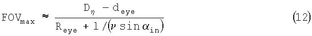 В этой работе представлены методы для преодоления этой проблемы. Для этого применяются увеличительный телескоп внутри подложки и непараллельные собирательные направляющие. Но даже при этом, и еще при том, что применяется только одна отражательная поверхность, толщина системы остается примерно той же. FOV ограничивается диаметром проекции отражательной поверхности 12 на плоскость подложки. При таком ограничении максимальное поле обзора будет: