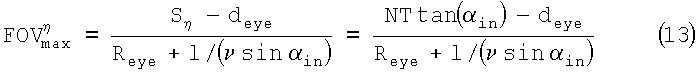 фиг.13 демонстрирует два графика зависимости искусственно вычисленной прозрачности от поля обзора (FOV) всего изображения проекционного дисплея, и зависимость вида снаружи от того же поля обзора;