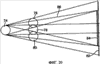 На фиг.17 показан пример дисплея с подложкой, где в качестве источника дисплея используется жидкокристаллический индикатор. Свет, исходящий от источника 64 и выровненный коллимирующей линзой 66, освещает жидкокристаллический дисплей 68. Оттуда изображение выравнивается и, проходя через оптические компоненты 70, поступает на подложку 20. На фиг.18 показана схема оптической коллимирующей линзы 70, а на фиг.19 – след от луча света, попадающего на подложку 20, на переднюю грань 72 линзы 70. Как правило, для большинства источников дисплеев работает принцип распространения света Ламберта. Таким образом, энергия распределяется равномерно на угловом спектре в 2 стерадиан. Однако, как показано на фиг.18 и 19, только небольшая порция света от источника дисплея достигает подложки 20. От каждого точечного источника на поверхности дисплея только небольшой пучок – 20-30° – фактически освещают след на передней поверхности 72 и попадает на подложку 20. Следовательно, можно добиться значительного увеличения яркости, если свет от дисплея концентрируется внутри этого пучка.