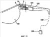 Фиг.23 представляет изображение настоящего изобретения, в котором LOE 20 встроен в окуляр 100. Источник излучения 4, коллимируюшая линза 6 и откидная (поворотная) линза 70 установлены на кронштейне 102 внутри рамы окуляра в непосредственной близости к краю светопроводного оптического элемента LOE 20. В том случае, если источник излучения дисплея является электронным элементом, как, например, в небольших электронно-лучевых трубках CRT, жидкокристаллических дисплеях LCD или излучающей диодной матрицей OLED, управляющая электроника 104 может быть размещена внутри задней части кронштейна 102. Источник электропитания интерфейса по данным 106 можно соединить с кронштейном 102 при помощи провода или любым другим способом соединения, включая оптическое или радиосоединения. В качестве альтернативы батарея и миниатюрная электроника, обслуживающая канал передачи данных, может быть интегрирована в раму окуляра.