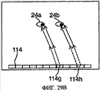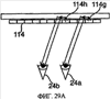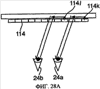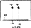 На фиг.27а и 27b показан вид прямо и вид сверху соответственно подобной компоновки, основанной на настоящем изобретении, которая может быть использована для создания 3D дисплея. Вместо одинарного дисплейного источника применена сеть 114, состоящая из n различных источников 1141-114n, размещенных в нижней части подложки 20, где каждый из них проецирует картинки, представляющие собой различные перспективы одной сцены. Картинка с каждого дисплейного источника собирается на подложке способом, подобным описанному выше и проиллюстрированным на фиг.26. В момент, когда пользователь рассматривает дисплей, его правый 24а и левый 24b глаза видят изображение, проецируемое источниками 114i и 114j соответственно. Следовательно, наблюдатель видит каждым глазом одну и ту же сцену, показываемую с различных точек. Создаваемое впечатление очень напоминает ощущение, когда вы наблюдаете реальную 3D картинку сквозь окно. Как видно из фиг.28а-28b, когда наблюдатель перемещает свой взгляд в горизонтальной плоскости, он видит изображение, создаваемое разными источниками 114k 114l; получаемый эффект напоминает движение головой во время просмотра какой-либо сцены за окном. Когда же наблюдатель перемещает взгляд вертикальной плоскости, как показано на фиг.28А-28В, его глаза наблюдают точки на подложке, расположенные на уровень ниже предыдущих. Так как эти точки расположены ближе к дисплейным источникам 114, наблюдатель видит картинки, поступающие с источников 114g-114h, расположенных ближе к центру сети источников 114, чем предыдущие. В результате ощущения, получаемые наблюдателем, сродни тем, что возникают при просмотре сцены, расположенной ближе к окну. Другими словами, просмотр сцены через подложку представляет собой просмотр трехмерной панорамы, где нижняя ее часть находится ближе к наблюдателю.