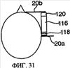 Более удобная конструкция показана на фиг.31. Здесь устройство располагается не перед пользователем, но сбоку его головы, и центр тяжести усилителя выровнен вдоль главной оси головы. Компоновка устройства выполнена по обратной схеме, то есть коллиматор 118 расположен сзади, а окуляр 120 впереди. Теперь изображение внешней сцены передается в коллиматор 118 при помощи LOE 20а, где картинка из окуляра 120 передается в глаз наблюдателя при помощи второго LOE 20b. Несмотря на наличие дополнительных оптических элементов 20а и 20b, привнесенных в оригинальную схему, вес которых очень мал по сравнению с весом SLA, и в целом вся система является намного более удобной в обращении. Более того, в связи с тем, что снимаются жесткие ограничения по точности установки данных устройств, вполне возможно воплотить их в модульной форме, что позволит оператору двигать или даже перемещать их. Подобным образом SLA окуляр может быть переконфигурирован для удобства использования прикрепленного к голове LOE или для установки на стандартные подставки или для других целевых применений, где модуль LOE не задействован. Возможно также смещать LOE элементы с целью подгонки для удобства работы с устройством при помощи любого глаза.