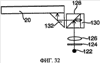 Одна из областей применения, которая может быть серьезно продвинута посредством применения LOE, – это отражающие LCD. Фиг.25 демонстрирует пример дисплея, в котором дисплейным источником служит отражающий LCD. Свет, испускаемый иллюминатором 122, пропускается через поляризатор 124, коллимируясь линзой 126, отражается поляризованным расщепителем пучка (светового) 128 и освещает LCD 130. Поляризация света, отраженного от LCD, поворачивается на 90° площадкой размером в 1/4 длины волны или, в качестве альтернативы, самим материалом LCD. Теперь изображение из LCD проходит через расщепитель, чтобы быть коллимированным и отраженным на подложку 20 при помощи линзы 132. В результате подобная компоновка системы иллюминации, содержащей расщепитель, получается крупногабаритной и конечно недостаточно компактной для применения в системах, связанных с креплением их к голове. Более того, так как расщепитель 128 и коллимирующая линза 132 располагаются на более удаленном расстоянии от дисплейного источника с целью снижения искажений, рекомендуется прикадровую линзу размещать как можно ближе к поверхности дисплея.