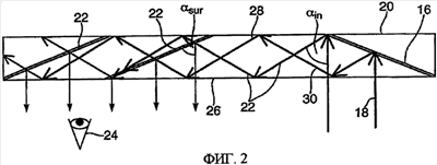 Как видно из фиг.2, лучи достигают отражающих поверхностей по двум различным направлениям 28, 30. В этом конкретном варианте исполнения лучи падают на отражательную поверхность 28 после четного количества отражений от поверхностей подложки 26, где угол падения между лучом и нормалью к отражательной поверхности равен: