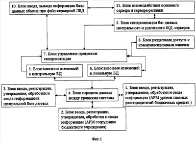 При этом изобретение решает задачу – обеспечить для класса “удаленных” пользователей (то есть таких пользователей, для которых невозможна (или не требуется) непосредственная работа с сервером центральной базы данных) процесс синхронизации данных локальной и центральной баз, создавая тем самым возможность доступа к информации центральной базы данных по низкоскоростным коммутируемым каналам. Вместе с тем, обеспечивается создание высокоэффективной и надежной автоматизированной системы управления бюджетным процессом, позволяющей функционировать в условиях непрерывно продолжающегося роста объемов и усложнения структуры информации, роста числа пользователей и увеличением их информационных потребностей.