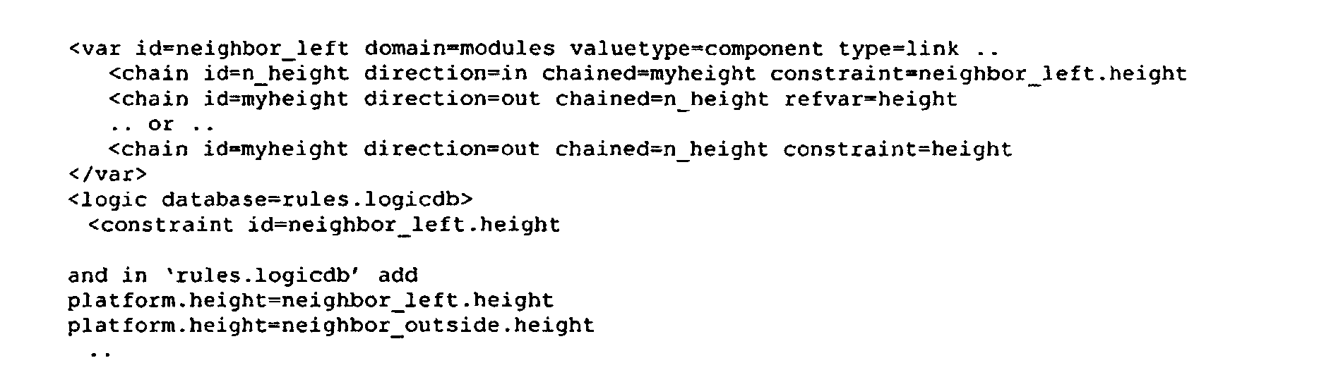 Теперь рассматривается установка компонентной переменной, то есть создание новой связи. Выше на этапе 9 устанавливаемой переменной была компонентная переменная, так что ее установка имеет побочный эффект фактического создания нового компонента (ladder1), который добавлен к мгновенной МИ, и соединен с platform2. Обычно, это осуществляют следующим образом: