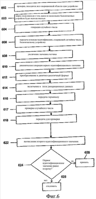 Фиг.6 иллюстрирует примерную процедуру проведения транзакции с использованием системы, изображенной на Фиг.1. Терминал 106 может выполнять необязательную проверку, для того чтобы удостоверится, что только одно бесконтактное устройство 102 находится внутри его операционной области (этап 602). Если в операционной области находится более одного бесконтактного устройства 102, то терминал может запросить пользователя о том, какое бесконтактное устройство будет использоваться (этап 603). В любом случае, терминал 106, или эмитент 110, или бесконтактное устройство 102 генерирует случайное число (этап 604). Это случайное число может быть сгенерировано, например, при помощи традиционного алгоритма генерации случайных чисел, или аппаратным генератором случайных чисел, и может быть в двоично-десятичном BCD или шестнадцатеричном (HEX) формате. Такие алгоритмы генерации случайных чисел и аппаратные генераторы случайных чисел хорошо известны. Терминал 106 передает команду идентификации, содержащую случайное число, бесконтактному устройству 102 (этап 606). Бесконтактное устройство 102 содержит бесконтактную микросхему 103, имеющую двоичный счетчик и увеличивающую значение счетчика при каждом получении команды идентификации (этап 608). Значение счетчика может быть в BCD или HEX или двоичном формате. Бесконтактная микросхема 103 в бесконтактном устройстве 102 выводит (получает) первое идентификационное значение, используя первый идентификационный ключ, из принятого случайного числа (этап 610). Если используется инфраструктура безопасности на основе стандарта шифрования данных DES, то предпочтительно, чтобы первый идентификационный ключ являлся секретным ключом, совместно используемым с эмитентом. Если используется инфраструктура открытого ключа (PKI), то предпочтительно, чтобы первый идентификационный ключ являлся секретным ключом, связанным с конкретным бесконтактным устройством. В любом случае, первый идентификационный ключ может быть сохранен, например, в памяти бесконтактной микросхемы 103. Схема 105 бесконтактного коммуникационного интерфейса может являться составной частью бесконтактной микросхемы 103 или быть отделенной от нее. Бесконтактное устройство 102 включает первое идентификационное значение в набор данных сообщения – опционально в поле дискреционных данных сообщения дорожки 1 и/или дорожки 2 – (этап 614) и бесконтактно передает данные сообщения терминалу 106 (этап 616) через бесконтактный интерфейс 105. Данные сообщения также включают в себя случайное число и значения счетчика, поддерживаемое на бесконтактной микросхеме 103, или их некоторое представление. Предпочтительно, чтобы случайное число или его представление в данных сообщения проверялись (этап 617) в терминале 106 при помощи сравнения со случайным числом, ранее переданным устройству 102. Представлением случайного числа могут быть, например, три последние цифры более длинного числа, ранее переданного устройству. Если первое идентификационное значение не было отформатировано (на этапе 614) бесконтактным устройством 102, как часть поля дискреционных данных сообщения дорожки 1 и/или дорожки 2, то это форматирование может быть выполнено терминалом 106 или агентом эмитента 110. Агент может быть приложением эмитента, выполняемым на компьютере пользователя, – то есть персональном компьютере с устройств