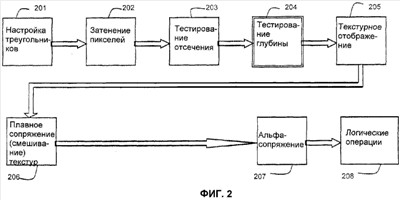 Фиг.2 изображает схематическое представление трехмерного графического конвейера согласно примеру первого варианта осуществления настоящего изобретения. Как показано, конвейер включает в себя стадию 201 настройки треугольников, стадию 202 затенения пикселей, стадию 203 тестирования отсечения, стадию 204 тестирования глубины, стадию 205 текстурного отображения, стадию 206 плавного сопряжения (смешивания) текстур, стадию 207 альфа-сопряжения и стадию 208 логических операций.