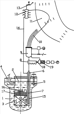 На чертеже представлена схема ядерной энергетической установки, реализующей предлагаемое техническое решение. В ядерном реакторе 1 с жидкометаллическим свинцовым теплоносителем или его сплавами под его свободным уровнем 2 размещены активная зона 3, парогенераторы 4 и средства циркуляции 5. По периметру активной зоны 3 установлены трубки Фильда 6, центральные каналы 7 которых через запорно-регулирующий клапан 8 сообщены с водяным объемом емкости 9, расположенной выше реактора 1. К верхней части емкости 9 подключены охлаждаемые воздухом теплообменные трубы 10, расположенные в воздушной шахте (трубе) 11. Теплообменные трубы 10 объединены верхним коллектором 12, на котором установлен предохранительный клапан 13. Нижняя часть верхнего коллектора 12 сообщена трубопроводами 14 с внешними кольцевыми каналами 15 трубок Фильда 6. Над активной зоной установлены тяговые трубы 16 и 17, причем высота центральных труб 16 больше высоты периферийных труб 17. Золотник 18 запорно-регулирующего клапана 8 соединен с механизмом его перемещения 19, сообщенным с полостью емкости 9.