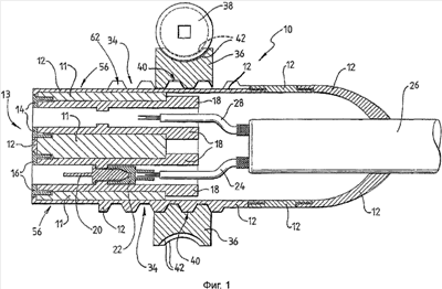 Соединитель 10 является вилкой, которая содержит изоляционный корпус 11, который имеет по существу цилиндрическую форму и внешнюю оболочку 12, образованную из металлического и/или изоляционного полимерного материала. Соединитель 10 имеет торцевую поверхность 13, которая имеет три апертуры (на фиг.1 показано только две апертуры), которые ограничены муфтами, например муфтами 14 и 16. Из каждой апертуры внутрь выступает изоляционная втулка 18. Штыревой контакт 20 соединен с наконечником 22, который соединен с отдельной жилой 24 многожильного машинного кабеля 26. Дополнительная жила 26 многожильного машинного кабеля также показана (не соединенной).