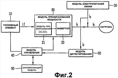 В одном варианте осуществления модуль преобразования DC/DC 21 преобразовывает постоянное напряжение в переменное напряжение, повышает или понижает переменное напряжение, выпрямляет получающееся напряжение и выдает постоянное напряжение. Инвертор 22 преобразовывает постоянное напряжение от модуля преобразования DC/DC 21 в переменное напряжение соответственно управляющему сигналу и выдает переменное напряжение. В соответствии с настоящим изобретением инвертор 22 изменяет выходной ток соответственно управляющему сигналу, таким образом препятствуя тому, чтобы ток i1, генерируемый системой топливного элемента, попал в модуль 30 питания линии. Т.е. инвертор 22 управляет током i1 через выходные контакты системы топливного элемента для предотвращения попадания тока в модуль питания линии.