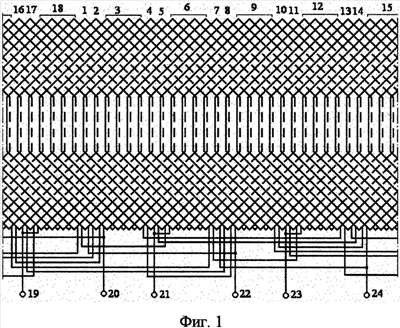 Согласно фиг.1 двухполюсная обмотка асинхронной машины состоит из катушечных групп 1-18 с выводами 19-24, при этом начало 1 катушечной группы соединено с концом 5 катушечной группы, начало 5 с началом 14, конец 14 с началом 10, конец 12 с концом 3, начало 13 с концом 17, начало 17 с началом 8, конец 8 с началом 4, конец 6 с концом 15, начало 7 с концом 11, начало 11 с началом 2, конец 2 с началом 16, конец 18 с концом 9, выводы взяты от объединенных конца 16 и начала 18 катушечных групп, от объединенных конца 16 и начала 18 катушечных групп, от объединенных конца 4 и начала 6 катушечных групп, от объединенных конца 10 и начала 12 катушечных групп, от объединенных конца 13 и начала 3 катушечных групп, от объединенных конца 7 и начала 15 катушечных групп, от объединенных конца 1 и начала 9 катушечных групп.