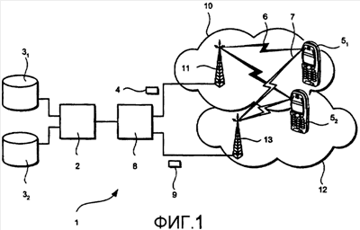 Информацию 4 можно передавать, используя межсетевой протокол (IP), через цифровую широкополосную сеть, типа наземной сети цифрового телевидения (ЦТВ-Н), в виде услуги преобразования типов данных IP (ПТД-IP), на одно или более приемные устройства 51, 52. Приемные устройства 51, 52, в форме мобильных телефонов с возможностями видеоизображения, сконфигурированы для приема данных по меньшей мере по двум различным каналам 6, 7 связи.