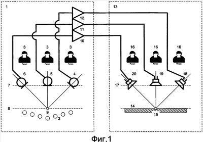 В помещении для прослушивания 13 слушатели 16, акустические системы 18, 19, 20 на вертикальной плоскости 17, а также вертикальная плоскость для восстановления звуковой картины 14 с центром восстанавливаемой звуковой картины 15 размещены эквивалентно размещению слушателей 3, микрофонов 4, 5 и 6 на плоскости 7, плоскости 8 с центром записываемой звуковой картины 9 в помещении для записи 1. Акустические оси акустических систем или полос сводятся в центр воспроизводимой звуковой картины 15.