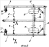 При подаче масла в штоковую полость силового гидроцилиндра 27 механизма 12 последний втягивается в полость силового гидроцилиндра 27 и увлекает за собой ось 26 и кулак 17. Кулак 17 (на фиг.4 и 8) в этом случае поворачивается на шлицевом валу 23 против часовой стрелки, увлекая за собой кривошип 16 и цапфу 32. За счет поворота цапфы 32 снизу вверх правая шина 11 (см. фиг.4) с наклонного положения переводится в вертикальное состояние (см. фиг.3). Одновременно с этим кулак 16 на другом конце шлицевого вала 23 также поворачивается против часовой стрелки. Осями 25 и 26 разнонаклонные к горизонту шатуны 19 и 18 механизма 12 приводятся в движение и своими левыми концами кривошипы 15 и 14 приводятся в угловое движение по часовой стрелке, поворачивая шлицевой вал 22 в подшипниках скольжения вилки 20, а цапфа 31 левую шину 11 низкого давления с наклонного положения (см. фиг.4) приводит в вертикальное положение (см. фиг.3). Эти угловые перемещения цапф 32 и 31 привели к тому, что площадь контакта шин 11 с опорной поверхностью увеличилась, снижая этим удельное давление на почву. Одновременно с этим силовая балка 59 центральной секции 2 опустилась вниз. Универсальные шарниры Гука на концах силовых балок 59 и 60 центральной и боковых секций 2, 3 и 4 привели их в рабочее состояние, приняв параллельное положение относительно поверхности технологической площадки. Таким образом, силовая балка 60 левой боковой секции 3, силовая балка 59 центральной секции 3 и силовая балка 60 правой боковой секции 4 заняли фронтальное положение.