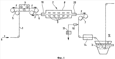Как можно видеть на фиг.1, в камере для обработки расположено некоторое число электродов 9, которые необходимы для того, чтобы образовалась плазма, с помощью которой производится удаление окалины. Детальные подробности приведены в названных выше источниках.
