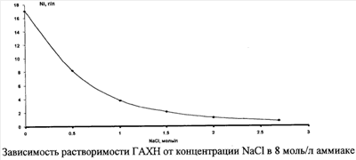 Выход никеля определяется растворимостью ГАХН в конкретных условиях концентрации хлорид-ионов, количеств аммиака и никеля в системе. Если аммиака, содержащегося в насыщенном водном растворе, недостаточно для количественного образования комплексного иона [Ni(NH3)6]2+, то в случае необходимости переработать большие количества никеля, следует барботировать газообразный аммиак в систему. В конце процесса образуется осадок ГАХН и насыщенный аммиаком маточный раствор с остаточной концентрацией никеля, соответствующей концентрации хлорид-ионов. Очевидно, что чем больше количество никеля, тем больше относительный выход никеля в осадок.