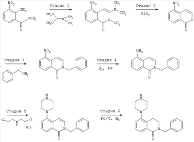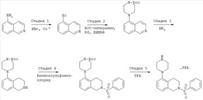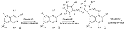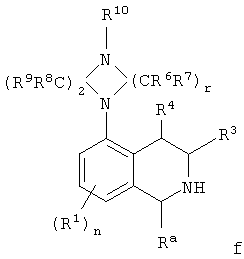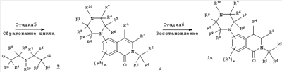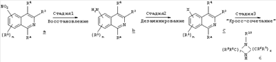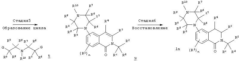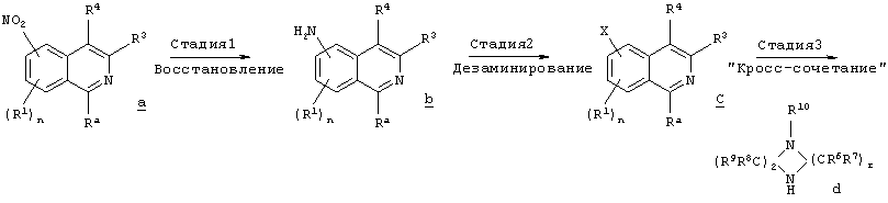 Другим объектом настоящего изобретения является композиция, включающая терапевтически эффективное количество не менее одного соединения формулы I и фармацевтически приемлемый носитель. Еще одним объектом настоящего изобретения является способ лечения патологического состояния центральной нервной системы (ЦНС) у субъекта, включающий введение субъекту терапевтически эффективного количества соединения формулы I. Патологическое состояние может включать, например, психозы, шизофрению, маниакальные депрессии, невралгические нарушения, нарушения памяти, синдром нарушения внимания, болезнь Паркинсона, боковой амиотрофический склероз, болезнь Альцгеймера или болезнь Гентингтона. Еще одним объектом настоящего изобретения является способ лечения нарушения желудочно-кишечного тракта у субъекта, включающий введение субъекту терапевтически эффективного количества соединения формулы I. Другим объектом настоящего изобретения является способ получения соединения формулы I. Соединения, предлагаемые в настоящем изобретении, можно получить с помощью множества способов, представленных на иллюстративных схемах реакций синтеза и описанных ниже. Исходные вещества и реагенты, использующиеся при получении этих соединений, обычно или продаются поставщиками, такими как Aldrich Chemical Co., или получаются по методикам, известным специалистам в данной области техники по процедурам, описанным в литературе, такой как Fieser and Fieser’s Reagents for Organic Synthesis; Wiley&Sons: New York, 1991, Volumes 1-15; Rodd Исходные вещества и промежуточные продукты для этих схем реакций синтеза при необходимости можно выделить и очистить с помощью обычных способов, включая, но не ограничиваясь только ими, фильтрование, перегонку, кристаллизацию, хроматографию и т.п. Такие вещества можно охарактеризовать с помощью обычных средств, включая физические характеристики и спектральные данные. Если не указано иное, то описанные в настоящем изобретении реакции предпочтительно проводить в инертной атмосфере при атмосферном давлении и в диапазоне температур от примерно -78°С до примерно 150°С, более предпочтительно – от примерно 0°С до примерно 125°С и наиболее предпочтительно и удобно – при температуре, близкой к комнатной (или окружающей среды), например, примерно при 20°С. Приведенная ниже схема А иллюстрирует одну методику синтеза, применимую для получения конкретных соединений формулы I, в которых G обозначает галоген или другую отщепляющуюся группу и n, r, R1, R2, R3, R4, R6, R7, R8, R9, R10 и Ra являются такими, как определено в настоящем изобретении. СХЕМА А На стадии 1 схемы А нитроизохинолин а восстанавливают в аминоизохинолин b. Это селективное восстановление нитрогруппы можно провести в относительно мягких условиях с использованием Н2 в присутствии Pd или Pt в качестве катализатора. Различные нитрозамещенные изохинолины, применяющиеся на этой стадии, имеются в продаже или могут быть получены по известным методикам. На стадии 2 реакцию дезаминирования проводят в присутствии кислоты НХ и порошкообразной меди в окислительной водной среде для получения замещенного изохинолина с, причем Х обозначает галоген, предпочтительно – бром или хлор. Различные аминозамещенные изохинолины имеются в продаже или могут быть получены по известным методикам для использования на этой стадии. На стадии 3 используют реакци