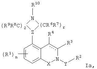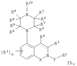 в которой n, r, X, Y, Z, R1, R2, R3, R4, R6, R7, R8, R9 и R10 являются такими, как определено в настоящем изобретении. В некоторых вариантах выполнения r равно 2 и Z обозначает азот, так что R5 обозначает необязательно замещенную пиперазинильную группу. В таких вариантах выполнения соединения формулы I можно представить формулой Ih: