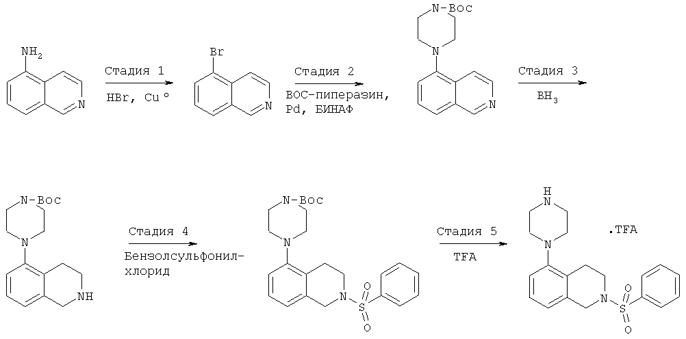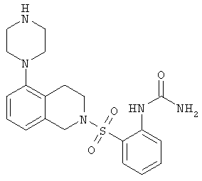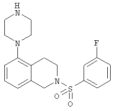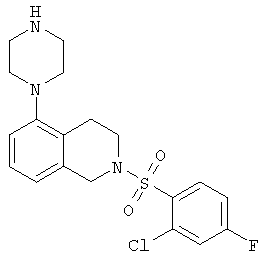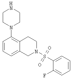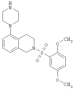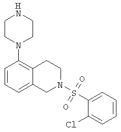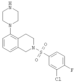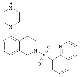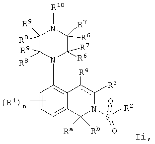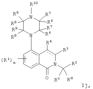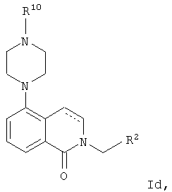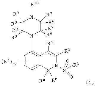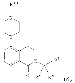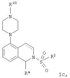 или его фармацевтически приемлемая соль или пролекарство, в которой R2, R10, —, Rc и Rd являются такими, как определено в разделе (iii). (vi) Соединение из раздела (iv), в котором R2 обозначает фенил или нафталинил, которые необязательно содержат заместители в соответствии с разделом (iii). (vii) Соединение из раздела (vi), в котором R2 выбран из группы, включающей фенил, 2-фторфенил, 3-фторфенил, 4-фторфенил, 2-хлорфенил, 3-хлорфенил, 3-метилфенил, 4-метоксифенил, 2-метансульфонилфенил, 4-амидофенил, 4-мочевинофенил, 3,5-дихлорфенил, 2,3-дихлорфенил, 2,5-дихлорфенил, 3,5-ди(трифторметил)фенил, 2,5-диметоксифенил, 3-хлор-4-фторфенил, 2-хлор-4-фторфенил, нафталин-1-ил, нафталин-2-ил и хинолин-8-ил. (viii) Соединение из раздела (iv), в котором R10 обозначает водород или метил. (ix) Соединение из раздела (iv), в котором указанное соединение выбрано из группы, включающей: 2-бензолсульфонил-5-пиперазин-1-ил-1,2,3,4-тетрагидроизохинолин; 2-бензолсульфонил-5-(4-метилпиперазин-1-ил)-1,2,3,4-тетрагидроизохинолин; 2-(4-фторбензолсульфонил)-5-пиперазин-1-ил-1,2,3,4-тетрагидроизохинолин; 2-(4-метоксибензолсульфонил)-5-пиперазин-1-ил-1,2,3,4-тетрагидроизохинолин; 2-(3-фторбензолсульфонил)-5-пиперазин-1-ил-1,2,3,4-тетрагидроизохинолин; 2-(3,5-дихлорбензолсульфонил)-5-пиперазин-1-ил-1,2,3,4-тетрагидроизохинолин; 2-(3,5-бис-трифторметилбензолсульфонил)-5-пиперазин-1-ил-1,2,3,4-тетрагидроизохинолин; 2-(2,5-диметоксибензолсульфонил)-5-пиперазин-1-ил-1,2,3,4-тетрагидроизохинолин; 2-(3-хлор-4-фторбензолсульфонил)-5-пиперазин-1-ил-1,2,3,4-тетрагидроизохинолин; 2-(2-фторбензолсульфонил)-5-пиперазин-1-ил-1,2,3,4-тетрагидроизохинолин; 2-(2-хлорбензолсульфонил)-5-пиперазин-1-ил-1,2,3,4-тетрагидроизохинолин; 2-(3-хлорбензолсульфонил)-5-пиперазин-1-ил-1,2,3,4-тетрагидроизохинолин; 2-(3-метилбензолсульфонил)-5-пиперазин-1-ил-1,2,3,4-тетрагидроизохинолин; 2-(2,3-дихлорбензолсульфонил)-5-пиперазин-1-ил-1,2,3,4-тетрагидроизохинолин; 2-(2-хлор-4-фторбензолсульфонил)-5-пиперазин-1-ил-1,2,3,4-тетрагидроизохинолин; 2-(2,5-дихлорбензолсульфонил)-5-пиперазин-1-ил-1,2,3,4-тетрагидроизохинолин; 2-(нафталин-1-сульфонил)-5-пиперазин-1-ил-1,2,3,4-тетрагидроизохинолин; 2-(нафталин-2-сульфонил)-5-пиперазин-1-ил-1,2,3,4-тетрагидроизохинолин; 2-(2-метансульфонилбензолсульфонил)-5-пиперазин-1-ил-1,2,3,4-тетрагидроизохинолин; 3-(5-пиперазин-1-ил-3,4-дигидро-1Н-изохинолин-2-сульфонил)-бензамид; [2-(5-пиперазин-1-ил-3,4-дигидро-1Н-изохинолин-2-сульфонил)-фенил]-мочевину и 8-(5-пиперазин-1-ил-3,4-дигидро-1Н-изохинолин-2-сульфонил)-хинолин. (х) Соединение из раздела (v), в котором R2 обозначает фенил и R10 обозначает водород или метил. (xi) Соединение из раздела (v), в котором указанное соединение выбрано из группы, включающей: 2-бензил-5-пиперазин-1-ил-3,4-дигидро-2H-изохинолин-1-он и 2-бензил-5-(4-этилпиперазин-1-ил)-3,4-дигидро-2H-изохинолин-1-он. (xii) Способ получения соединения формулы