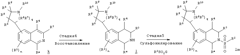 описанной выше, причем в формуле Ii Rb обозначает водород. Многочисленные варианты методик представленных на схеме А, выполнимы и должны быть очевидны для специалистов в данной области техники после рассмотрения настоящего раскрытия. Например, гетероциклилзамещенный изохинолин e можно получить непосредственно по реакции азотистого иприта (бис-(2-хлорэтил)-амина) с амином b, если опустить стадии 2 и 3 схемы А. Реакция азотистого иприта с аминами с получением гетероциклов по такой схеме хорошо известна в данной области техники. Атом углерода в положении 1 тетрагидроизохинолина Ie по характеру является бензильным и относительно легко подвергается алкилированию, и, таким образом, в другом варианте схемы А алкильную группу Rb можно ввести в положение 1 с помощью обычных методик синтеза. Аналогичным образом, при необходимости можно подвергнуть алкилированию положение 4 тетрагидроизохинолина Ie. Кроме того, в некоторых вариантах выполнения можно подобрать положение и химическую природу групп R так, чтобы облегчить протекание реакции кросс-сочетания на стадии 3. Конкретные соединения формулы I также можно получить по методике, приведенной на схеме В, где G обозначает галоген или другую отщепляющуюся группу и n, q, R1, R2, R3, R4, R6, R7, R8, R9, R10 и Ra являются такими, как определено в настоящем изобретении. СХЕМА В На стадии 1 схемы В галогензамещенный изохинолин g обрабатывают алкиллитиевым реагентом или другим сильным основанием в безводной апротонной полярной среде и при охлаждении смесью (сухая углекислота)/ацетон и получают литиированный изохинолин h. Литиированный изохинолин h не выделяют и используют непосредственно на стадии 2. Алкилирование на стадии 2 проводят по реакции гетероциклического кетона i с литиированным изохинолином h с получением гетероциклилзамещенного изохинолина i. Гетероциклический кетон i может представлять собой, например, пирролидон (q=1) или пиперидон (q=2), которые имеются в продаже. Многие замещенные пирролидиноны и пиперидиноны также имеются в продаже или легко получаются по известным методикам синтеза, и их можно использовать на этой стадии. Если R обозначает водород, то защитную группу ВОС или другую схему с применением удаляемой защитной группы можно использовать для защиты незащищенного от воздействия атома азота гетероциклического кетона i и соответствующего атома азота гетероциклилзамещенного изохинолина i. На стадии 3 гетероциклилзамещенный изохинолин i, полученный на стадии 2, дегидратируют путем обработки мягкой кислотой и получают гетероциклилзамещенный изохинолин k, в котором гетероциклильный фрагмент является частично ненасыщенным. На стадии 4 гетероциклилзамещенный изохинолин k, полученный на стадии 3, восстанавливают и получают гетероциклилзамещенный тетрагидроизохинолин l. Это восстановление можно выполнить путем гидрирования с использованием платинового или палладиевого катализатора в мягких условиях в этаноле. На стадии 5 гетероциклилзамещенный тетрагидроизохинолин l, полученный на стадии 4, сульфонилируют с использованием сульфонилгалогенида R2SO2G по методике, описанной выше для схемы А, и получают гетероциклилзамещенный сульфонилированный тетрагидроизохинолин Im, предлагаемый в настоящем изобретении. Сульфонилгалогенид g может представлять собой, например, арилсульфонилгалогенид, ге