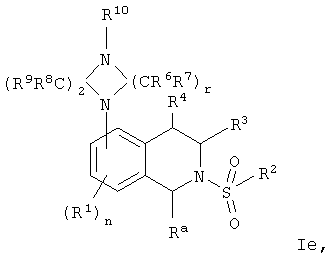 в которой: Z обозначает -N- или -СН-; предпочтительно, если Z обозначает -N-; r равно от 1 до 3; предпочтительно, если r равно 2; и R6, R7, R8, R9 и R10 независимо обозначают водород или алкил; предпочтительно, если R6, R7, R8, R9 и R10 обозначают водород. Если любой из R1, R3, R4, R6, R7, R8, R9, R10, Ra, Rb, Rc, Rd, Re и Rf обозначает алкил, то предпочтительно, если они обозначают низш. алкил, т.е. C1-С6алкил и более предпочтительно – С1-С4алкил. Следует понимать, что в объем настоящего изобретения входят не только различные изомеры, которые могут существовать, но и различные смеси изомеров, которые могут быть образованы. Кроме того, в объем настоящего изобретения также входят сольваты и соли соединений формулы I. В некоторых вариантах выполнения R может обозначать фенил, 2-фторфенил, 3-фторфенил, 4-фторфенил, 2-хлорфенил, 3-хлорфенил, 3-метилфенил, 4-метоксифенил, 2-метансульфонилфенил, 4-амидофенил, 4-мочевинофенил, 3,5-дихлорфенил, 2,3-дихлорфенил, 2,5-дихлорфенил, 3,5-ди(трифторметил)фенил, 2,5-диметоксифенил, 3-хлор-4-фторфенил, 2-хлор-4-фторфенил, нафталин-1-ил, нафталин-2-ил и хинолин-8-ил. Во многих вариантах выполнения настоящего изобретения R5 находится в положении 5 или 6 изохинолиновой кольцевой системы, а более предпочтительно – в положении 5, так что соединение формулы I можно представить формулой Ia: