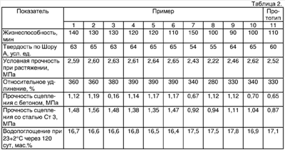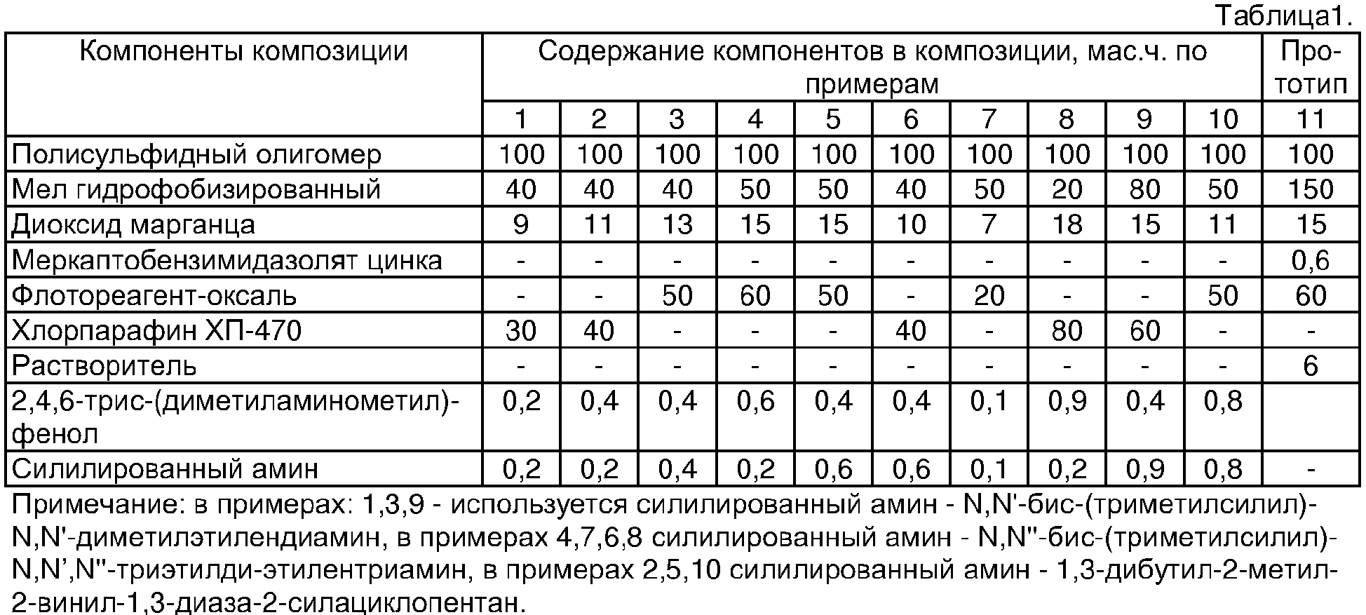 Для изготовления композиции используется смесительное оборудование, обеспечивающее получение гомогенной суспензии компонентов смеси. Смесь наносится равномерным слоем на основание и выдерживается до полного отверждения при 15-25°С в течение 7-10 суток. Испытания отвержденных образцов проводят по известным методикам: условная прочность и относительное удлинение в момент разрыва по ГОСТ 270-75, твердость по ГОСТ 263-75, водопоглощение и прочность сцепления с бетоном и со сталью Ст 3 по ГОСТ 26578-85, время жизнеспособности по ГОСТ 12812-80. Состав и свойства полимерной композиции для покрытия приведены в табл.1 и 2. Пример 1. В шаровую мельницу объемом 500 см3 в указанной последовательности загружают 100 г полисульфидного олигомера, 30 г пластификатора (в данном примере хлорпарафин ХП-470), 40 г мела гидрофобизированного, 0,2 г силилированного амина и 0,2 г 2,4,6-трис-(диметиламинометил)-фенола. Мельницу включают и проводят смешение в течение 3-5 часов. Полученную массу выгружают в стакан, добавляют 9 г диоксида марганца, перемешивают в смесителе в течение 5 мин, затем заливают в форму. Композицию выдерживают до полного отверждения в течение 7-10 суток при 25°С. Аналогичным способом готовятся композиции по примерам 2-10, состав которых указан в таблице 1, а свойства – в таблице 2. Как видно из таблицы 2, наилучшие показатели имеют композиции состава по примерам 1-6. Пример по прототипу. В шаровую мельницу объемом 500 см3 загружают 100 г полисульфидного олигомера, 60 г флотореагента-оксаль, 150 г гидрофобизированного мела и 0,6 г меркаптобензимидазолята цинка, предварительно растворенного в 6 г растворителя. Мельницу включают и проводят диспергирование в течение 3-5 часов. Полученную массу выгружают в стакан, добавляют 15 г диоксида марганца, перемешивают вручную в течение 5 мин, затем заливают в форму. Композицию выдерживают до полного отверждения в течение 7-10 суток при 25°С. Таким образом, предлагаемая композиция обеспечивает получение эластомерного материала с повышенными адгезионными, физико-механическими и гидроизоляционными свойствами. Композиция может использоваться для создания герметизирующих, гидроизолирующих, кровельных и антикоррозионных покрытий. Достаточная тиксотропность состава и свойства покрытия позволяют применять композицию для герметизации вертикальных примыканий бетонных и металлических оснований.