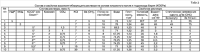 Для неустойчивых глин терригенных отложений раствор содержит хлорид калия в пределах 5-10 мас.%, а для солевых отложений и межсолевых глин – 5-30 мас.%