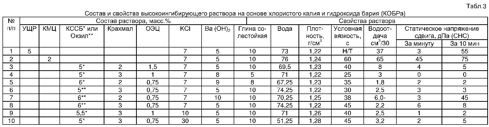 Изобретение относится к горному делу, в частности к строительству скважин в неустойчивых, склонных к осыпям или обвалам, сильно увлажненных глинах, в том числе соленасыщенных межсолевых глинах в хемогенных отложениях с высокими пластовыми температурами. Технический результат – повышение прочности, водоустойчивости глинистых пород, предупреждение осложнений из-за осыпей, обвалов и кавернообразования, течения пластичных глинистых пород, сужения ствола при бурении скважин. Ингибирующий буровой раствор для глинистых пород содержит, мас.%: солестойкую глину 5-10, хлорид калия 5-30, гидроксид бария 5-10, крахмал 2-3, конденсированную сульфит-спиртовую барду КССБ или окзил 5-6, оксиэтилцеллюлозу ОЭЦ 0,75-1,5, воду остальное. Указанный раствор содержит для неустойчивых глин терригенных отложений хлорид калия в пределах 5-10 мас.%, а для солевых отложений и межсолевых глин – 5-30 мас.%. 1 з.п. ф-лы, 3 табл., 2 ил.