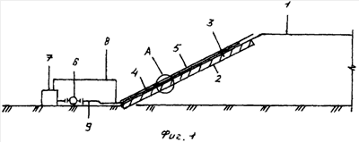 После отсыпки дамбы 1 производится планировка откоса 2. На откос 2 равномерно укладывается бетонная смесь 3 и система параллельных трубок 4, которая тщательно планируется и разравнивается. После укладки бетонной смеси 3 и параллельных трубок 4 они покрываются пленкой 5. Процесс нагнетания жидкости в параллельных трубках 4 осуществляется насосом 6. Система параллельных трубок 4 соединяется к обогревательному котлу 7 через нагнетательную линию 8 и обратную линию 9 с помощью соединительных муфт 10.