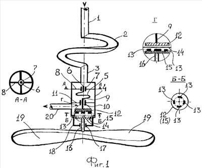 Лопасти 19 и 22 вместе с валом 16, или валом 9, или трубопроводом 20, на которых они соответственно могут быть закреплены, в целом можно считать вентилятором.