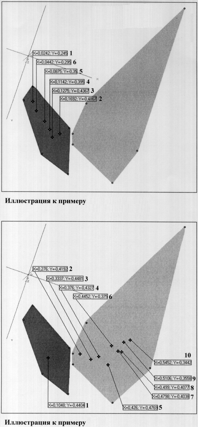 Под наблюдением в МЛПУ “Противотуберкулезный диспансер” Автозаводского района больная с февраля 2001 года, была взята на учет в I “A” группу диспансерного учета, после проведения комплексного клинического и лабораторного обследования был установлен диагноз: Диссеминированный туберкулез левого легкого в фазе инфильтрации и распада, наличием бактериовыделения (МБТ+). Результаты ИК-спектрометрии на этот момент составили: Х=0,1048, Y=-0,4404 (точка 1) (область активного туберкулеза). На чертеже результаты проведенных исследований ИК-спектроскопии представлены на иллюстрации к примеру 2, где область активного туберкулеза показана в виде темного многоугольника, а область неактивного туберкулеза – в виде светло-серого многоугольника.