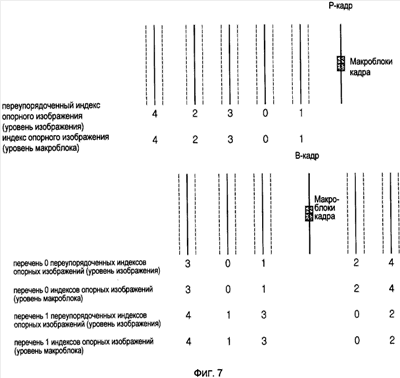 Соответственно, для изображений типа “кадр”, имеющих макроблок кадра/поля, используются индексы, имеющие различную структуру на уровне макроблока. Например, в макроблоке кадра используется индекс опорного изображения единицы кадра, а в макроблоке поля используется индекс опорного изображения единицы поля. Следует иметь в виду, что индексы опорных изображений могут быть переупорядочены на уровне изображения или сегмента.
