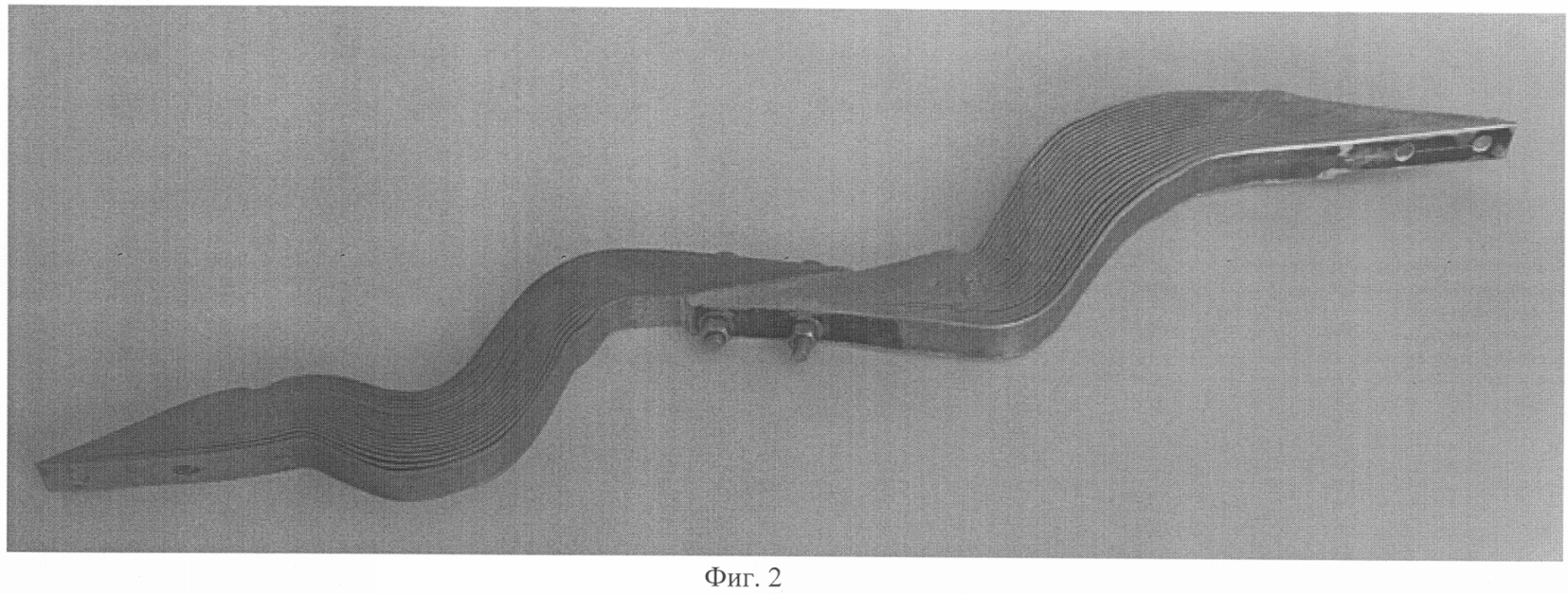 7. Способ изготовления гибкого токоподвода сваркой взрывом по п.6, отличающийся тем, что пакет собирают из полос последовательно уменьшающейся длины путем укладки на предшествующую длинную полосу, относительно ее оси симметрии по длине, полосу меньшей длины с образованием по концам пакета симметричных скосов, причем каждая последующая полоса короче предшествующей по длине, как минимум на 4а, где а – толщина полосы.