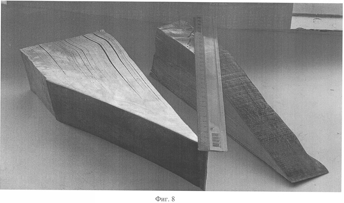 Аналогично проводили сварку по второму скосу. На фиг.8 представлена отрезанная поперек и разрезанная на три части (одна часть не показана) вдоль концевая часть пакета натурной алюминиевой ошиновки, сваренной энергией взрыва по изложенному выше способу. Количество гибких полос – 74 шт.
