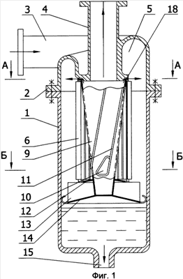 В нижней части усеченного конуса закреплены конусное днище 12, с образованием кольцевого зазора 16 с нижним торцом цилиндрического пакета пластин 6, радиальные пластины 13 и ложное конусное днище 14, с образованием кольцевого зазора 17 с корпусом 1 сепаратора. Верхний торец усеченного конуса 9 образует с нижним торцом выходного патрубка 4 кольцевой лабиринт 18. В нижней части корпуса сепаратора расположен сливной патрубок 15.