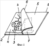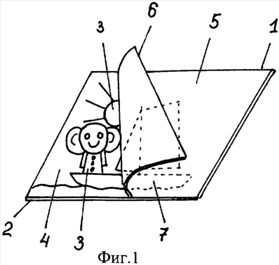 Устройство для рисования 1 может выполняться в разных вариантах. В простом и доступном варианте (фиг.1) изобретение выполняется в варианте стандартного альбомного листа, плотная бумажная основа которого выполняет функцию подложки 2 для нанесения на нее художественного изображения 3, которое может включать любые узнаваемые сказочные или реальные образы из живой или неживой природы, представлять одиночное изображение или сложную смысловую художественную картину, выполненные ручным, типографским, офсетным, фотографическим или иным промышленным способом. В смысловом значении изображение должно представлять собой красочную, многоцветную картинку, которую обычно используют при игре или работе с детьми и которая доступна для визуального эмоционального восприятия. Использование текстовых фрагментов, строгих геометрических форм или одноцветного изображения не несет эмоциональной нагрузки, учитывая возрастную категорию детей, для которых предназначено данное изобретение. В случае использования красок изображение может быть выполнено любым инертным и безвредным красителем, например гуашью, масляной краской, тушью. В данном случае это основной компонент информационного слоя 4, который, как правило, характеризуется такими физическими свойствами, как минимальным сродством к воде или минимальной гидрофильностью и определенной устойчивостью к механическим воздействиям. Оптимальным является нерастворимость основного компонента данного слоя. Коэффициенты растворимости в воде или гидрофильность красок или выполненных рисунков должны быть минимальные, чтобы сохранить изображение при смачивании водой. Кроме того, картина в некоторых вариантах изобретения может быть выполнена и другими известными способами, например нанесением нерастворимых цветных аппликаций и т.д., порошковой покраской, металлизацией и т.д. При использовании слаборастворимых красок необходимым является большее сродство к воде основного гидрофильного компонента одного из слоев, например основы поверхностной светорегулирующей диафрагмы, для визуализации имитационного изображения и создания имитации эффекта мазка. При использовании нерастворимого компонента светорегулирующей диафрагмы эффект может быть реализован отдельной промежуточной гидрофильной основой или аналогичным компонентом информационного слоя. Необходимым условием для полной реализации эффекта изобретения является разная степень гидрофильности и механическая устойчивость после смачивания основных компонентов слоев, предполагающих изменение физических и механических свойств гидрофильной основы преимущественно одного из слоев с целью получения эффекта мазка или растворения. Информационный слой 4 устройства как рисунок для визуального эмоционального восприятия ребенка, как правило, характеризуется определенной устойчивостью изображений и рисунков к поверхностным физическим воздействиям, главным образом к механическим воздействиям и к воздействию жидкости. Поэтому для этой цели используются нерастворимые или слаборастворимые в воде краски, пигменты, что отличает в этом варианте изобретения основное вещество данного слоя от компонентов светорегулирующей диафрагмы. Внутренний информационный слой определяет, в конечном итоге, интерес ребенка к творчеству чер