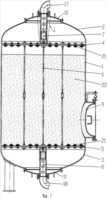 Фильтр состоит из цилиндрического корпуса 1, эллиптических днищ 2 и 3, верхнего 4 и нижнего 5 дренажных днищ, тяг 6, двух центральных стоек 7 и 8. Корпус 1 оснащен боковым люком 9, а эллиптические днища 2 и 3 – центральными люками 10 и 11 соответственно. Верхнее 4 и нижнее 5 дренажные днища выполнены перфорированными, неподвижно смонтированы в верхней и нижней частях корпуса 1, механически связаны с эллиптическими днищами 2 и 3 при помощи центральных стоек 7 и 8 соответственно и между собой – при помощи тяг 6. Каждая из центральных стоек 7 и 8 состоит из фланцевой перфорированной гильзы 12 с левой внутренней резьбой и перфорированного стакана 13 с правой внутренней резьбой, которые соединены между собой при помощи компенсационной втулки 14 с правой и левой наружной резьбой. К фланцам 15 выходного и входного отверстий люков 10 и 11 при помощи шпилек 16 с гайками прикреплены фланцевые гильзы 12 центральных стоек 7 и 8 и отводы 17 и 18 соответственно. Стаканы 13 центральных стоек 7 и 8 прикреплены к верхнему 4 и нижнему 5 дренажным днищам соответственно при помощи резьбовых концов 19 и гаек 20 центральной тяги 6, ось которой совпадает с осью фильтра. В одних отверстиях дренажных днищ 4 и 5 установлены дренажные колпачки 21, в других отверстиях, расположенных друг напротив друга, смонтированы тяги 6. Между дренажными днищами 4 и 5 помещена зернистая загрузка 22, например, ионообменная смола.