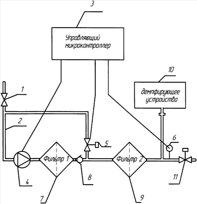 Принципиальная технологическая схема способа регенерации фильтрующих элементов включает узел подачи 1; транспортирующий трубопровод 2; управляющий микроконтроллер 3, соединенный с электронасосом 4, клапаном сброса давления 5 и датчиком давления на выходе 6; первый фильтр, он же – фильтр-накопитель 7; обратный клапан (запирающий) 8, второй фильтр – фильтр тонкой очистки 9; демпфирующее устройство 10, клапан на выходе 11.