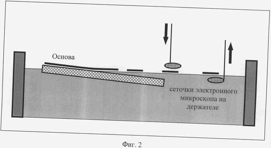 На стекло в качестве основы с нанесенным слоем мыла напылялся слой алюминия толщиной 30-40 нм. Полученный образец скрайбировался монтажной иглой на квадраты 3×3 мм. Алюминиевые квадраты переносились на поверхность воды описанным выше способом, откуда затем переносились на сеточки электронного микроскопа (фиг.2). На них, в свою очередь, наносилась пленка ЛБ. Тонкая металлическая пленка использовалась в качестве несущего слоя для пленки ЛБ, и способствовала стеканию заряда и отводу тепла от исследуемой пленки ЛБ.