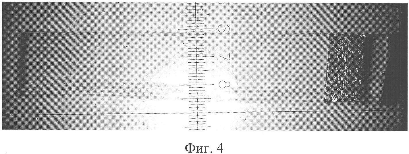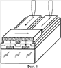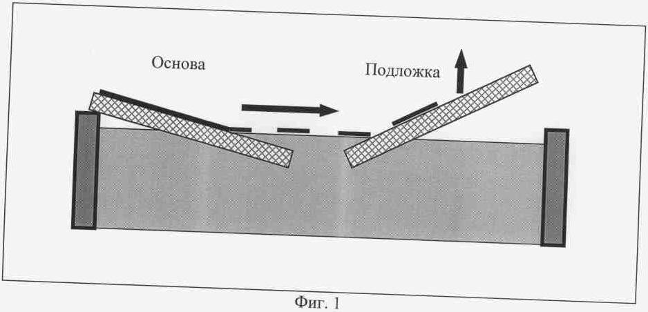 В данном примере в качестве подложки, на которую осуществлялся перенос тонкой металлической пленки с поверхности воды, была использована стеклянная пластина с нанесенными электродами ITO (indium tin oxide) в виде полос, с нанесенными на них пленкой ЛБ. Размер стеклянной пластины составил (25÷30)×(10÷15)×1,5 мм3. Толщина ITO полос – 15 мкм. Размер электрода – (25÷30)×0,9 мм2. Расстояние между электродами – 0,1 мм. Общий вид образцов представлен на фиг.4. Прохождение тока в этих структурах схематично показано на фиг.5 стрелками. В данной конфигурации прохождение тока обеспечивается наложенной сверху металлической пленкой, полученной описанным способом.