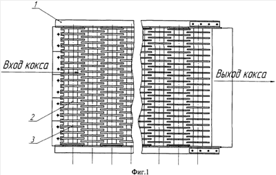 На раме 1 на одинаковом расстоянии друг от друга установлены валы 2. На них в шахматном порядке установлены диски 3. Направление подачи материала показано стрелкой. Увеличение толщины дисков в 1,125-1,25 раза, расположенных на валах со стороны подачи кокса, и номинального диаметра – на величину их утолщения, приводит к перераспределению отсева кокса по фракциям, заключающееся в отсеве более мелких фракций на валах с дисками увеличенного размера и более крупных фракций на валах с обычными дисками, что уменьшает неравномерность износа дисков, установленных на всех валах, в процессе эксплуатации грохота. При этом перераспределение отсева кокса по фракциям наиболее эффективно, если количество валов с дисками увеличенного размера составляет 0,36-0,43 от общего количества валов в грохоте. Увеличение толщины и диаметра дисков на валах со стороны подачи кокса сопровождается соответствующим уменьшением размера ячейки, что может затруднить сборку грохота. Поэтому увеличение толщины дисков более чем в 1,25 раза и диаметра на эту величину недопустимо. Увеличение же толщины и диаметра дисков менее чем в 1,125 раза не обеспечивает значительного увеличения срока службы грохота.