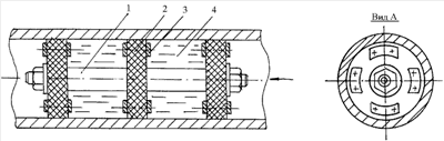 Устройство включает корпус 1, на котором установлены очистные элементы манжеты 2, выполненные, как правило, из резины или полиуретана и предназначенные для удаления асфальтосмолистых и грязепарафиновых отложений и для вытеснения продукта и инородных предметов из внутренней полости трубопровода. Кроме того, манжеты служат для центрирования устройства. На манжетах равномерно смонтированы расходуемые пластины 3 из магния, имеющие гарантированный зазор с поверхностью трубопровода. Пространство между манжетами заполняется минерализованной водой – 4.