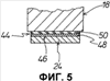 Фиг.4 показывает аналогичное Фиг.1 принципиальное представление другого варианта осуществления узла 10 для тиснения, причем вокруг обоих опорных валков 18 проходит лента 44 скольжения, на обращенной от опорных валков 18 наружной стороне 46 которой предусмотрена лента 24 для тиснения, как пояснено также на Фиг.5. Лента 24 для тиснения вращается вокруг обоих опорных валков 18 и вокруг направляющего валка 22. Лента 44 скольжения имеет несущий слой 48 и нанесенное на него покрытие 50 с малыми потерями на трение. Покрытие 50 с малыми потерями на трение обращено к обоим опорным валкам 18 и поверхности 34 скольжения предусмотренного между обоими опорными валками 18 опорного тела 32. Лента 44 скольжения с помощью натяжного устройства 52 может натягиваться до заданного значения вокруг обоих опорных валков 18.