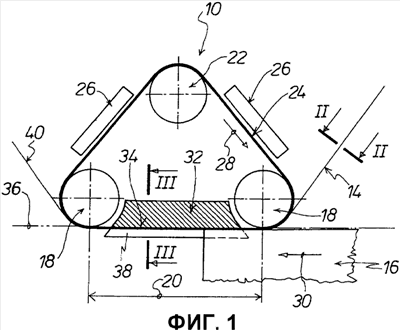 Узел 10 для тиснения имеет два расположенных на расстоянии друг от друга и осепараллельных друг другу опорных валка 18, которые задают участок 20 тиснения узла 10 для тиснения. На расстоянии от этих опорных валков 18 и осепараллельно к ним предусмотрен направляющий валок 22. Вокруг обоих опорных валков 18 и вокруг направляющего валка 22 направляется бесконечная лента 24 для тиснения.