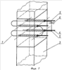 Фиг.3. Устройство для прогрева инъецированных каналов в колоннах каркаса: колонна, канал, натянутый канат, нить накаливания в канале имеет форму спирали, вертикальный разрез по оси канала.